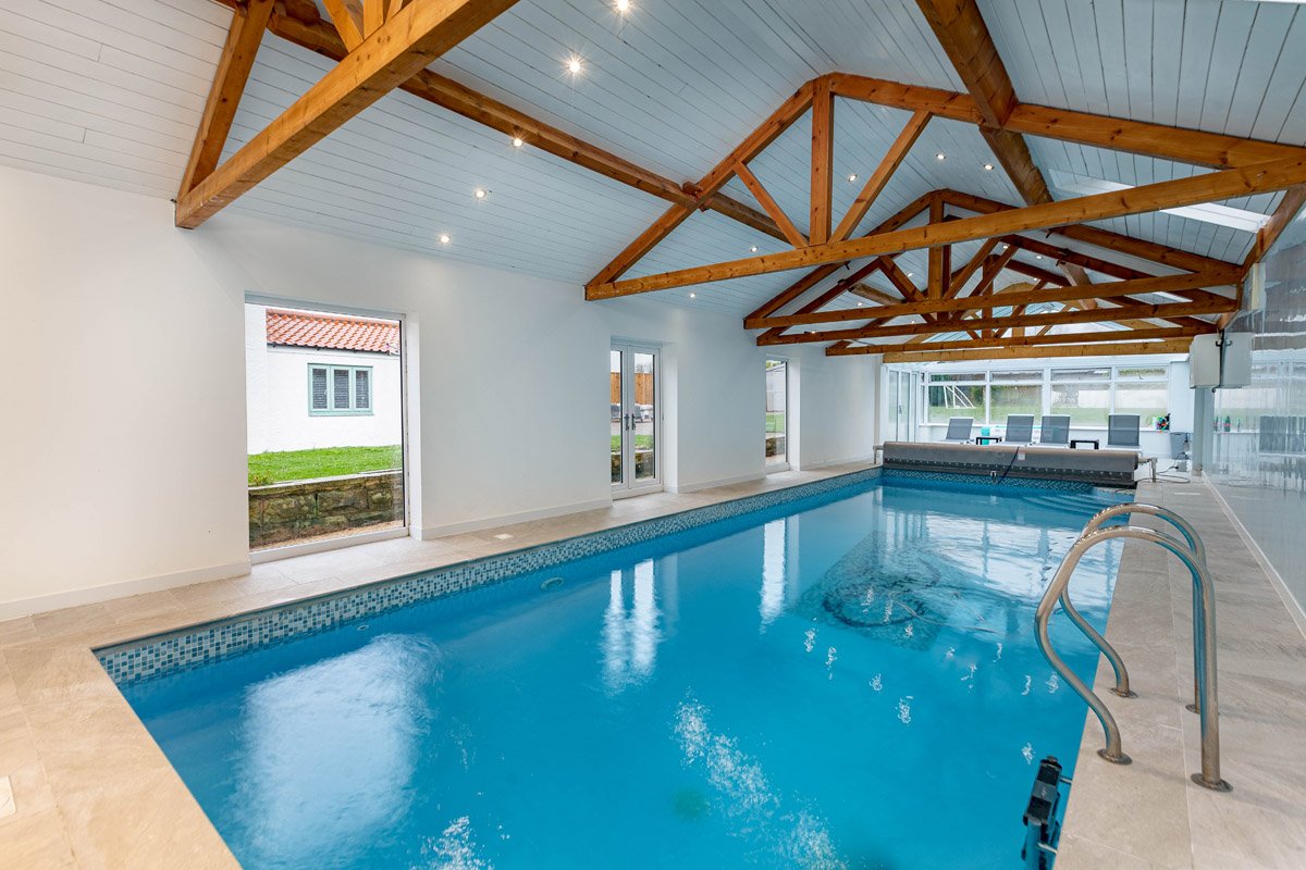 Light blue Venezia Stucco installation, polished to a mirror-finish as the final touch to this private swimming pool area.