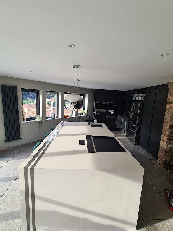 Light grey Microcement installation to this kitchen island with handcrafted Liquid Metal bands.